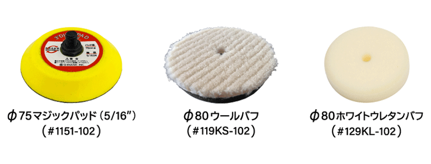 【標準付属品】Φ75mm(5/16)マジックパッド・Φ80mmウールバフ・Φ80mmウレタンバフ・アレンレンチ(5mm)・スパナレンチ・サービスオイル・エアープラグ(20PMタイプ)