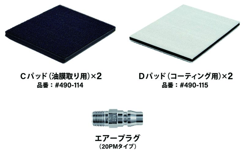 【標準付属品】・サービスオイル・エアープラグ(20PMタイプ)・Cパッド 油膜取り用(黒)・Dパッド コーティング用(白) 各2枚